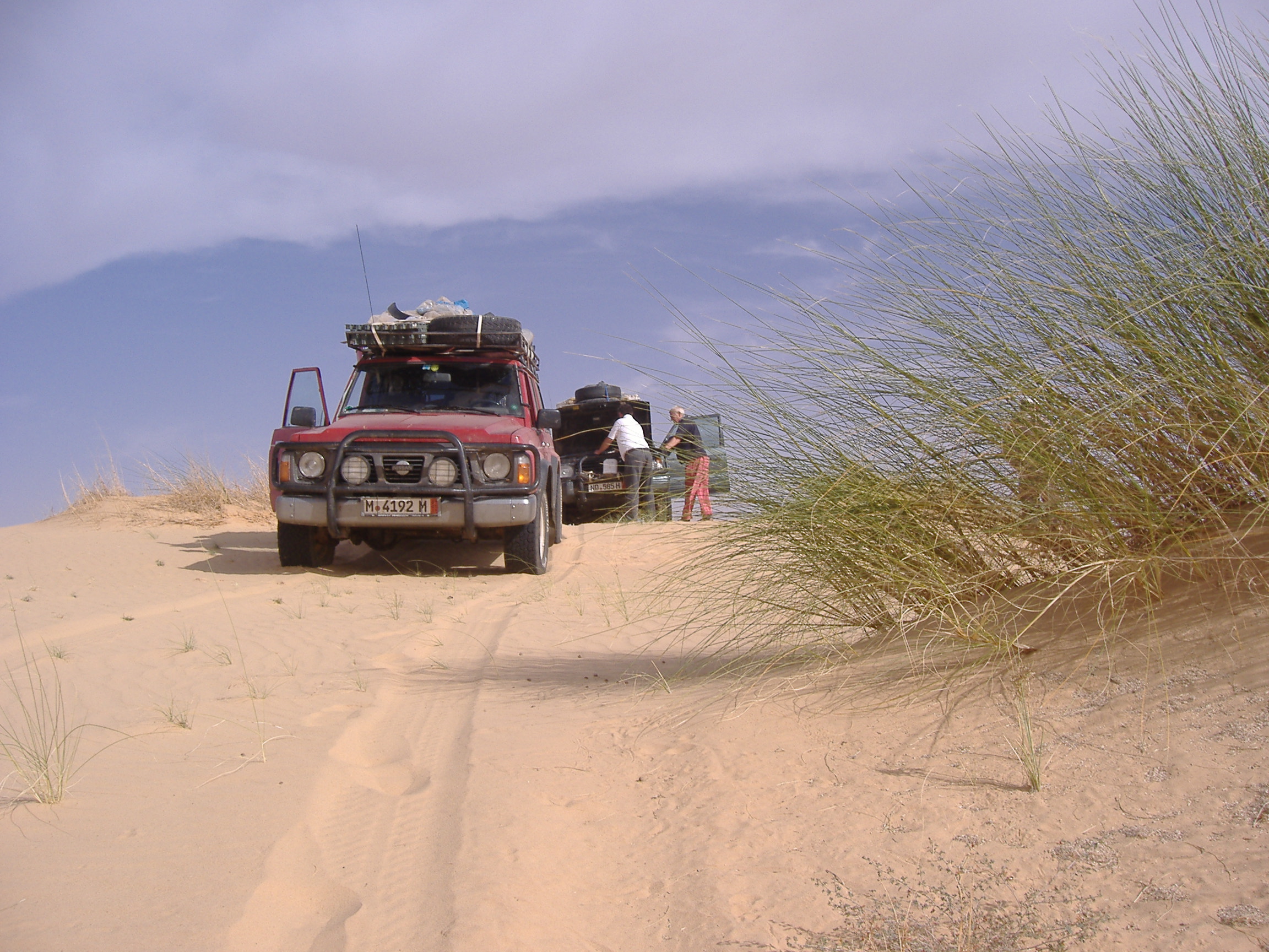 Martins Auto wird wieder warm; wir schütten Wasser nach.