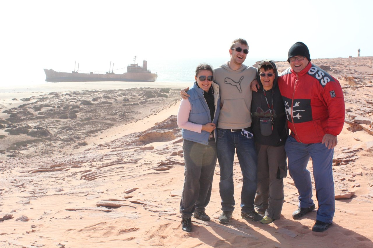 Dieter mit Töchtern und Enkel; im Hintergrund gestrandetes Schiff.